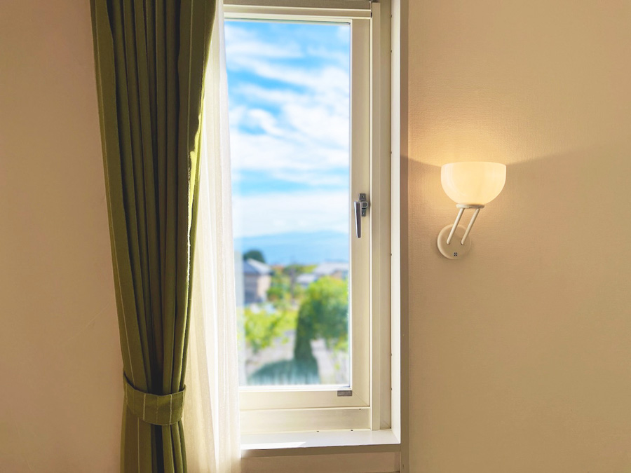 和の落ち着いた空間でたたみに寝転ぶ気持ちよさ、気持ちよくすごせる時間を大切にしました。和室と洋室はドアではっきりと区切られるスイート部屋です。海への窓から伊豆大島をのぞめます(天候不良時は見えません)。