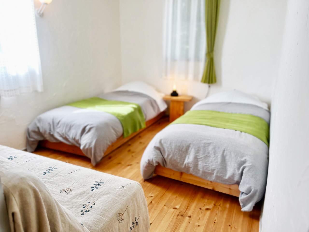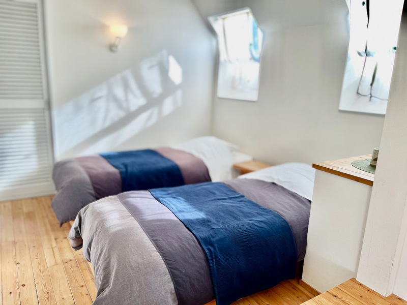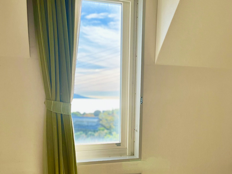 海への小窓。シンプルなカントリーツイン洋室です。お部屋からは伊豆大島をのぞめます。空気の澄んだ日は房総半島、伊豆七島まで一望。(天候不良時は見えません)。小上がりに冬はこたつをご用意します。