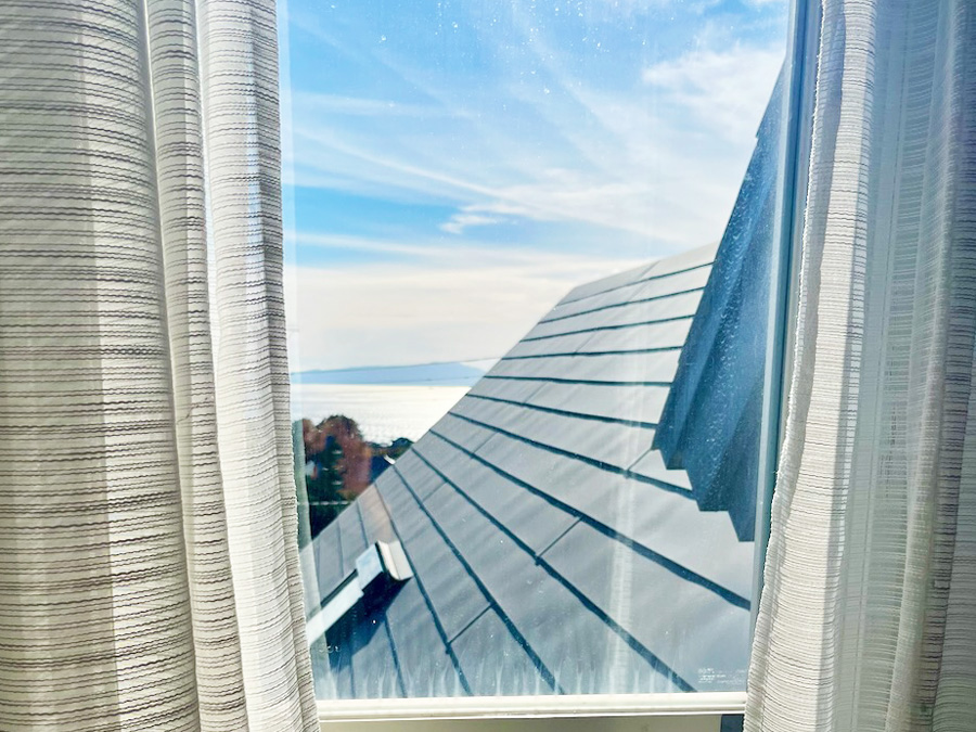 和の落ち着いた空間でたたみに寝転ぶ気持ちよさ、気持ちよくすごせる時間を大切にしました。和室と洋室はドアではっきりと区切られるスイート部屋です。海への窓から伊豆大島をのぞめます(天候不良時は見えません)。